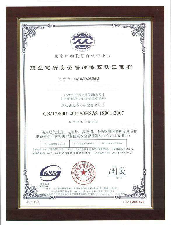 职业健康安全管理体系认证证书